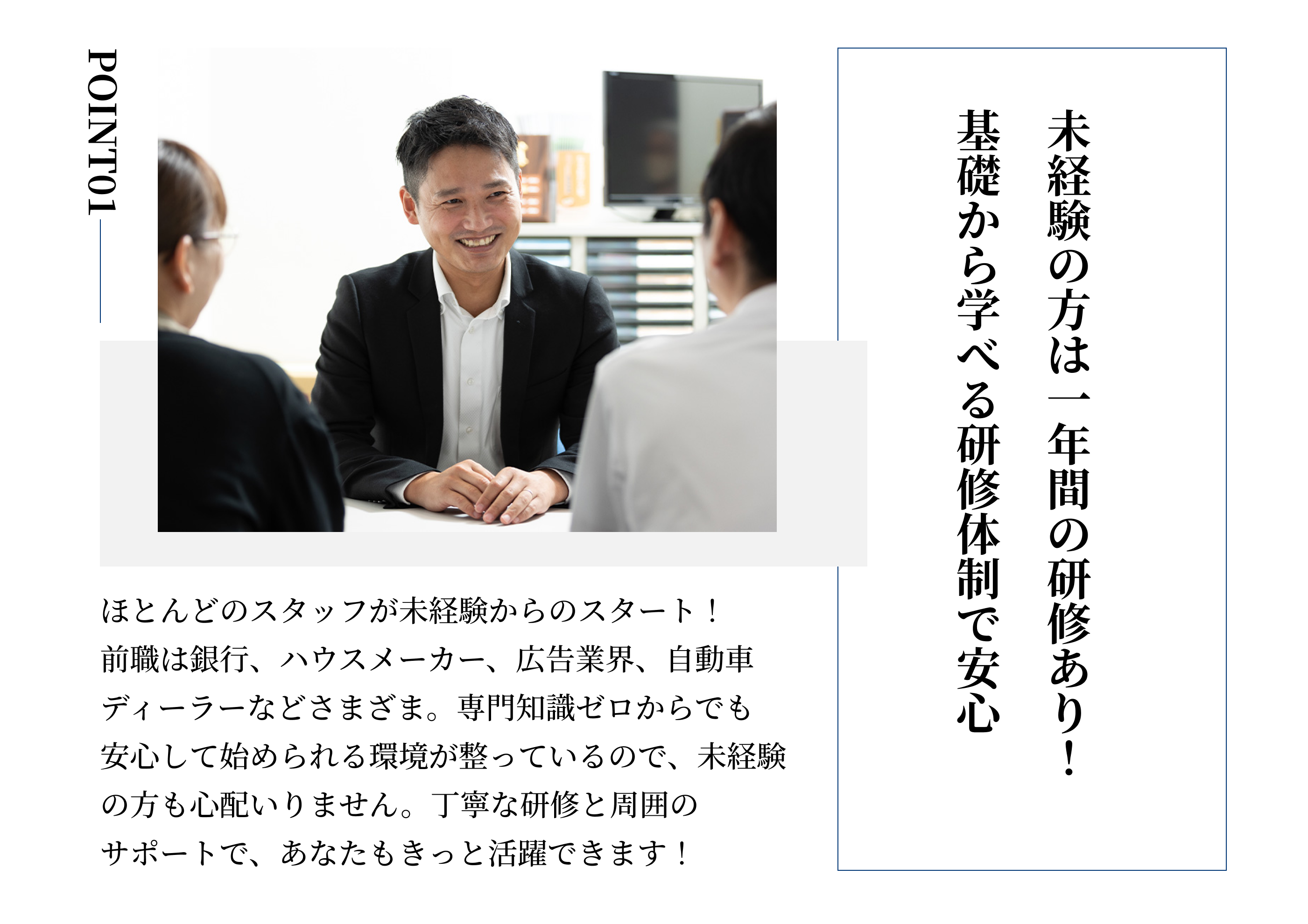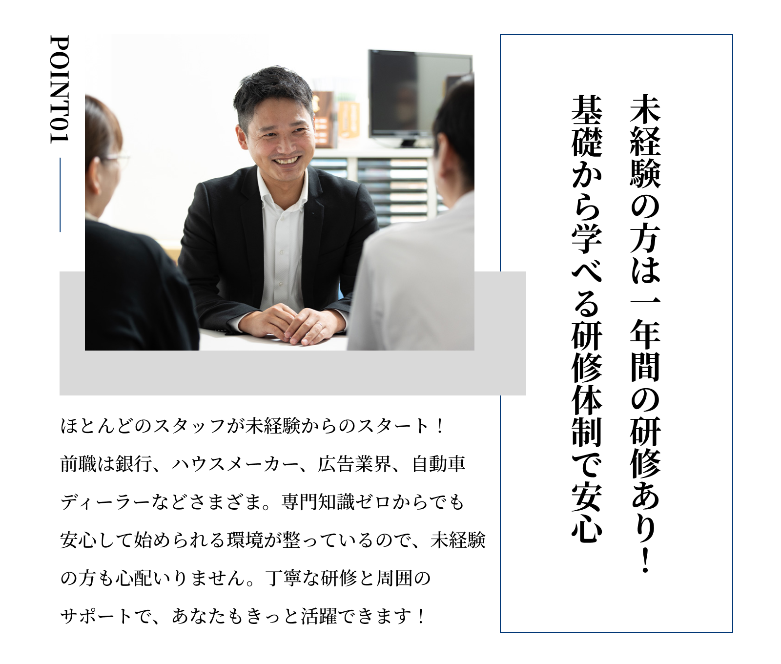 はい、ほとんどのスタッフが未経験からの入社です!銀行、ハウスメーカー、広告関係、自動車ディーラーなど、様々な業界からの転職者が活躍しています。充実した研修制度で安心してスタートできます。