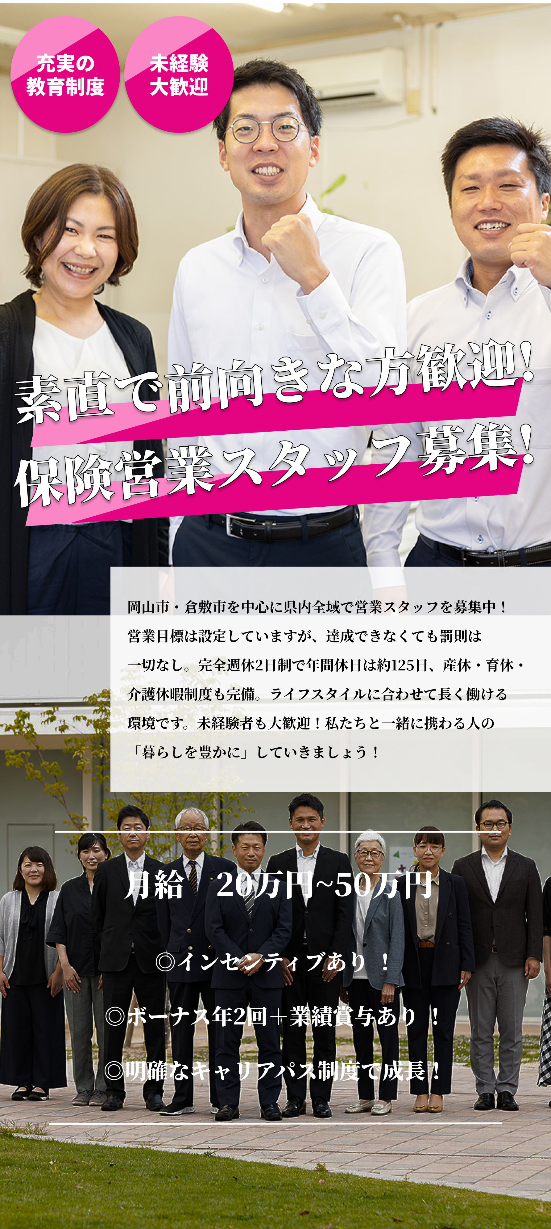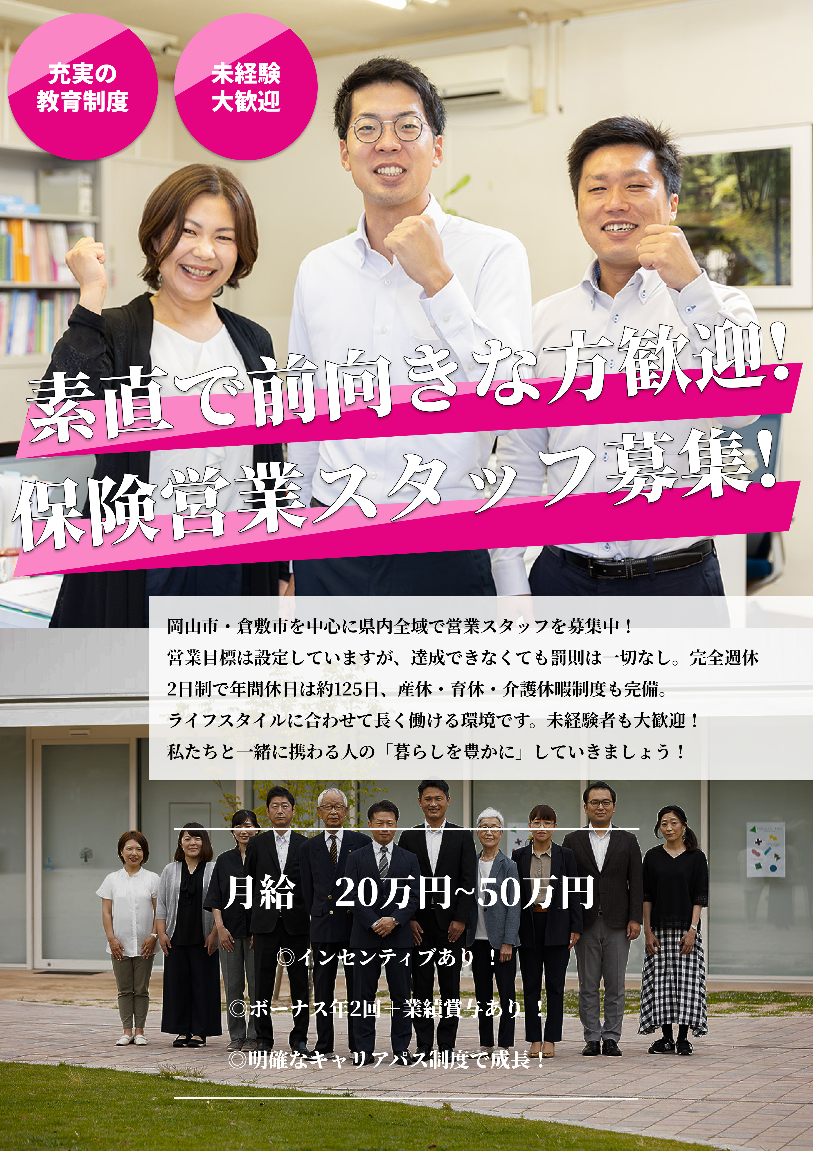 選考プロセス:①応募→②面接日決定→③面接→④内定→⑤入社 応募方法:お問い合わせページからご応募いただくか、 下記の電話番号までお気軽にお問い合わせください。 TEL:086-222-1131まで |